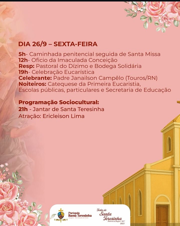 Confira a programação desta sexta-feira (26) da Festa da Padroeira de Tangará, Santa Teresinha.por J. Netto26 de setembro de 2025 Deixe um comentário Cancelar respostaO seu endereço de e-mail não será publicado. Campos obrigatórios são marcados com *Nome * E-mail * Site Comentário * Salvar meus dados neste navegador para a próxima vez que eu comentar.