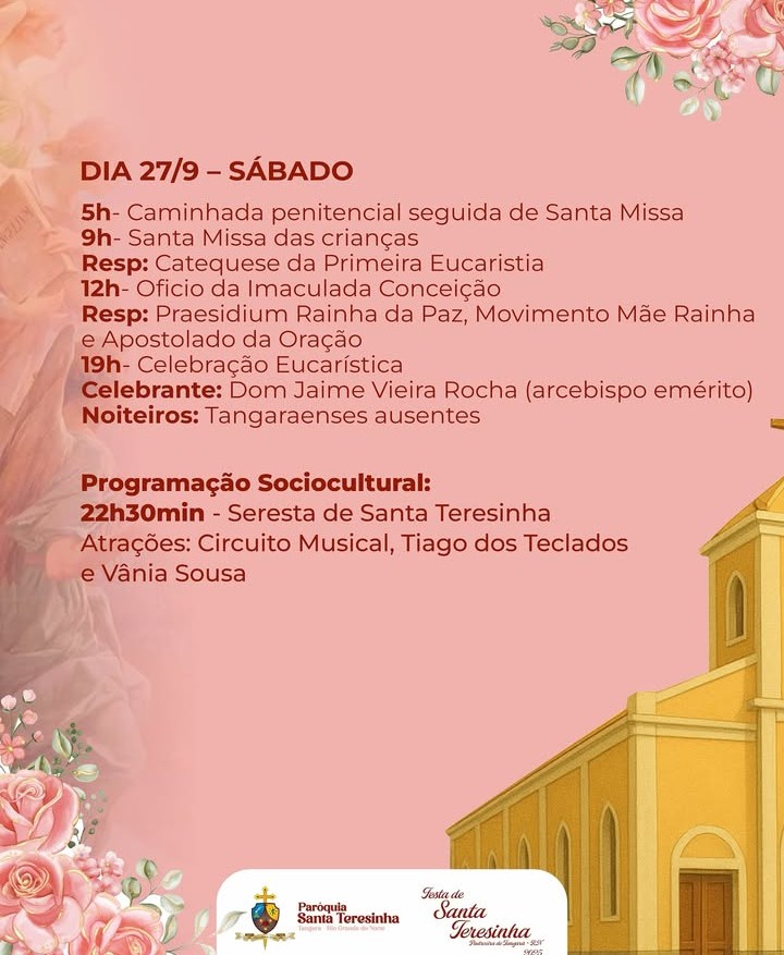 Confira a programação deste sábado (27) da Festa da Padroeira de Tangará, Santa Teresinha.por J. Netto27 de setembro de 2025 Deixe um comentário Cancelar respostaO seu endereço de e-mail não será publicado. Campos obrigatórios são marcados com *Nome * E-mail * Site Comentário * Salvar meus dados neste navegador para a próxima vez que eu comentar.