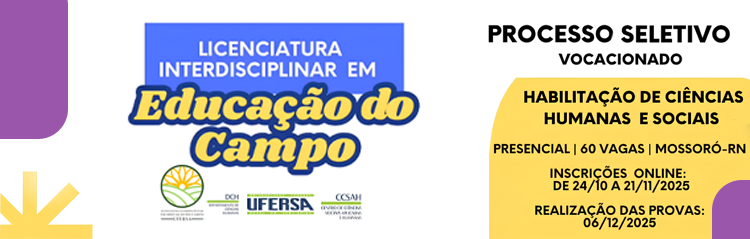 A Universidade Federal Rural do Semi-Árido (Ufersa) está com inscrições abertas para o Processo Seletivo Vocacionado (PSV) 2026.1 do curso de Licenciatura em Educação do Campo (LEDOC), habilitação em Ciências Humanas e Sociais, conforme o Edital nº 24/2025 – PROGRAD. O processo é voltado a candidatos ligados ao contexto rural que concluíram o Ensino Médio, mas ainda não possuem formação de nível superior. As inscrições serão realizadas entre os dias 24 de outubro e 21 de novembro de 2025, de forma on-line, por meio do site da Pró-Reitoria de Graduação da universidade.